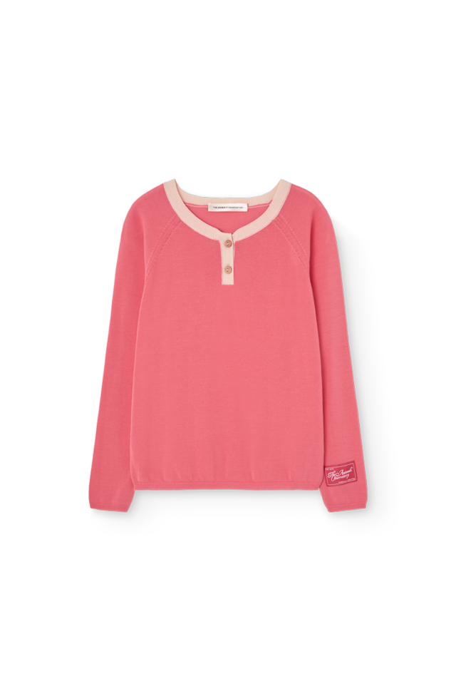 26SS【TAO】 コットンヘンリーニットピンク Bull Sweater THE ANIMALS OBSERVATORY 映えるようなきれいなピンク色の薄手コットンニット 首元のパイピングの配色がとてもおしゃれ どこにだって着て行けそう ▷The model's 137cm size 8y Regular Made in: Spain Composition: 100% Cotton